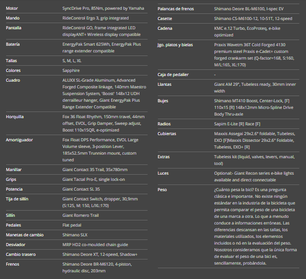 Marco: ALUXX SL-Grade Aluminum, Advanced Forged Composite linkage, 140mm Maestro Suspension System, 'Boost' 148x12 UDH derrailleur hanger, Giant EnergyPak Plus Range Extender Compatible.