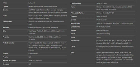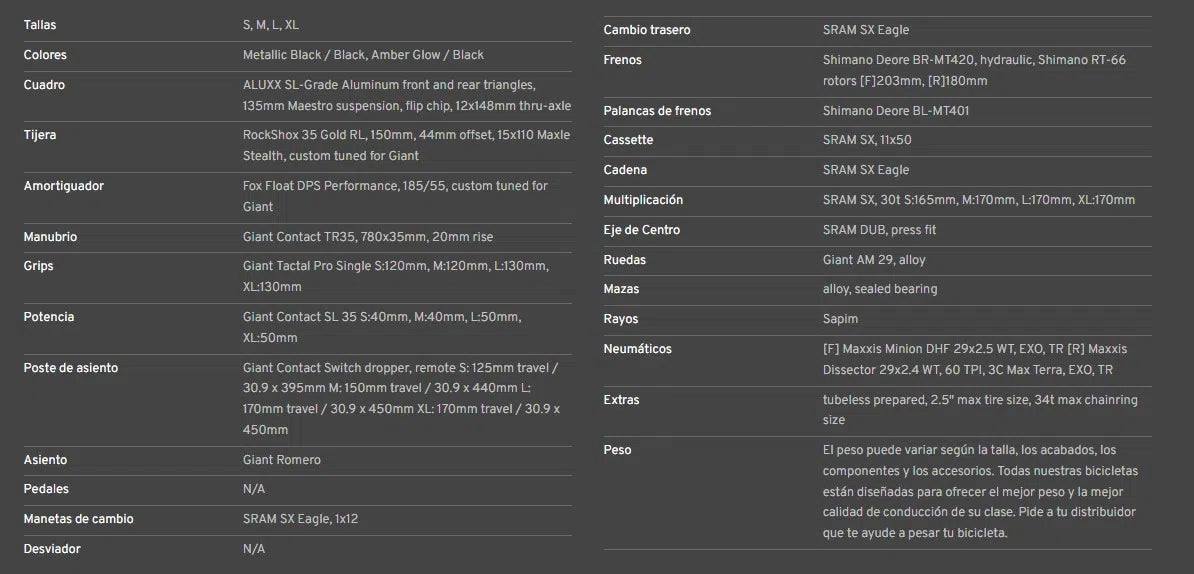 Suspensión: RockShox 35 Gold RL, 150mm, 44mm offset, 15x110 Maxle Stealth, custom tuned for Giant.