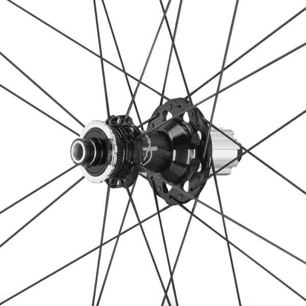 Ruedas de carbono con acabado unidireccional de perfil diferenciado delantero/trasero, perfil moderno redondeado, nuevos bujes de aluminio, sistema cono-cazoleta.