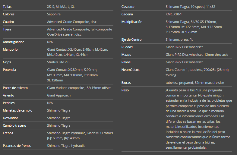 Frenos: Shimano Tiagra hidráulico, rotores Giant MPH [F]160 mm, [R]140 mm.